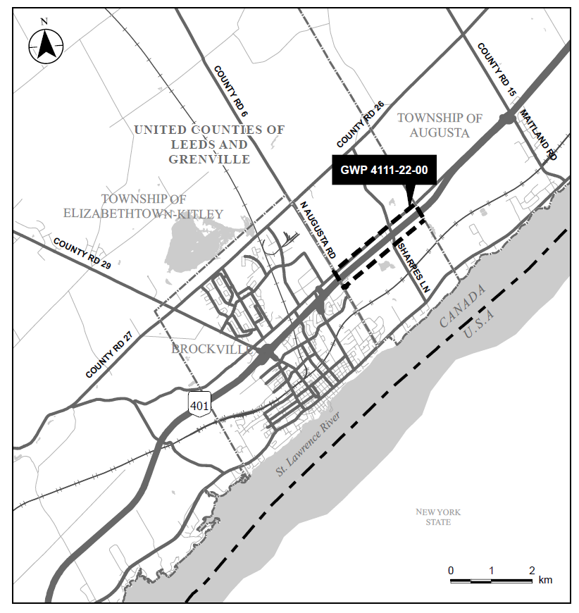 Welcome to the Highway 401 Planning Study in the Township of Elizabethtown-Kitley, in the United Counties of Leeds and Grenville. The Ontario Ministry of Transportation (MTO) has retained Stantec Consulting Ltd. to undertake a Preliminary Design, and Class Environmental Assessment (Class EA) Study on Highway 401 for the replacement and rehabilitation of one bridge and one culvert, and identifying the future Highway 401 footprint for an interim six lanes and ultimate eight lanes, from 0.75 km east of North Augusta Road to 3.3 km west of Maitland Road (approximately 2.6 km), in the Township of Elizabethtown-Kitley, east of Brockville.